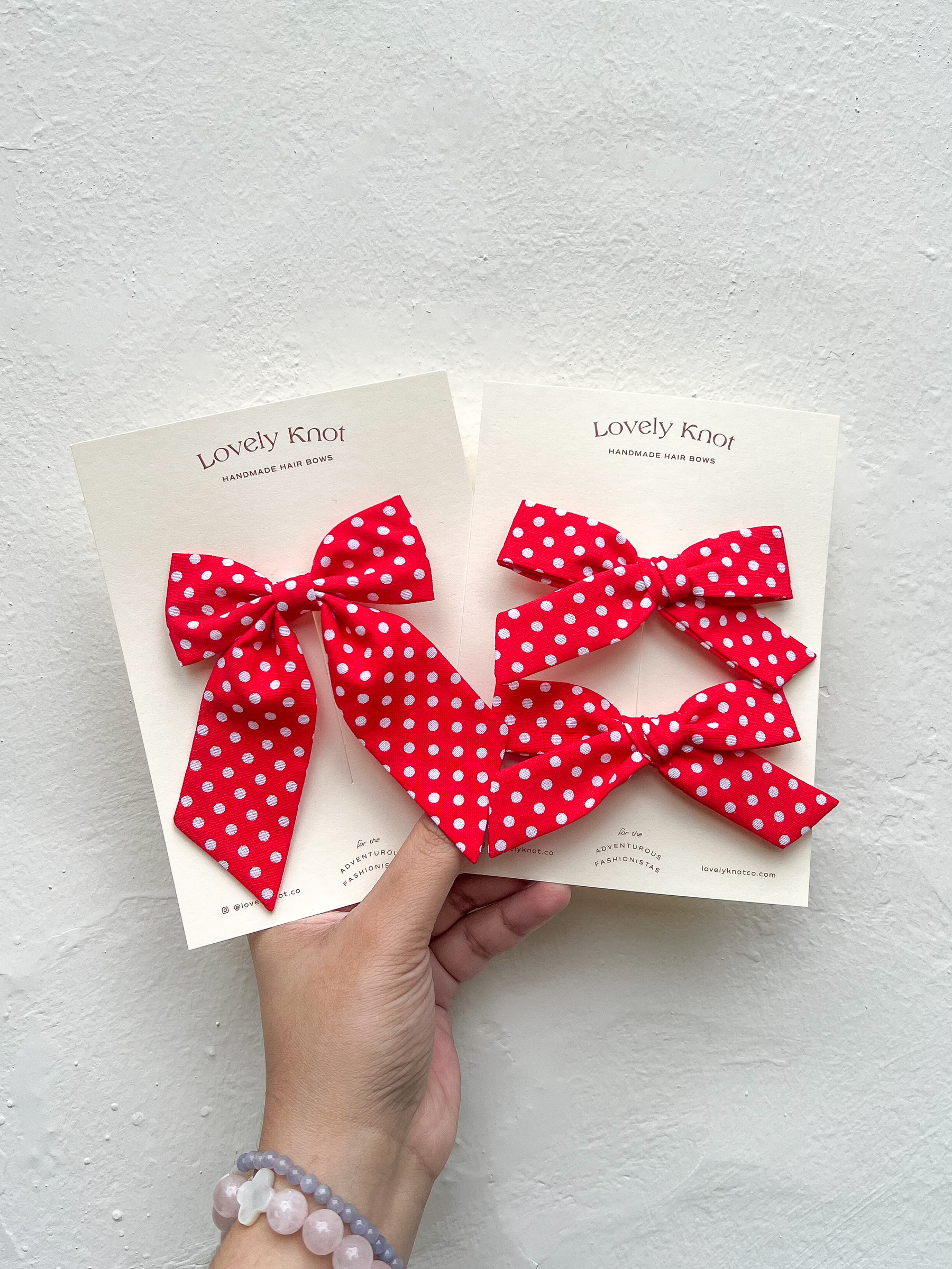 This pigtail set features two petit schoolgirl bows that are each 1½ x 3½ inches long. They are attached to alternating alligator clips and made fit your little one’s piggies securely yet comfortably.