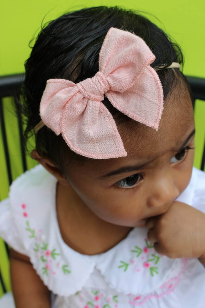 A Single-layer bow with a matching hemmed edge made of high-quality imported cotton fabric. They are attached to a right-sided alligator clip or a soft, one size fits all nylon headbands. Each approximate size is 3.5 x 3.5 inches long.